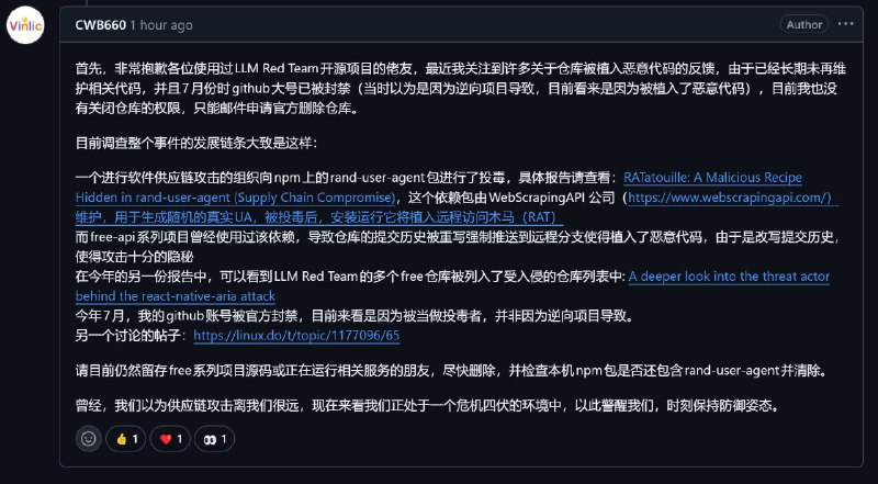 时刻惊醒,即便是开源软件也会有上流依赖包投毒的情况
